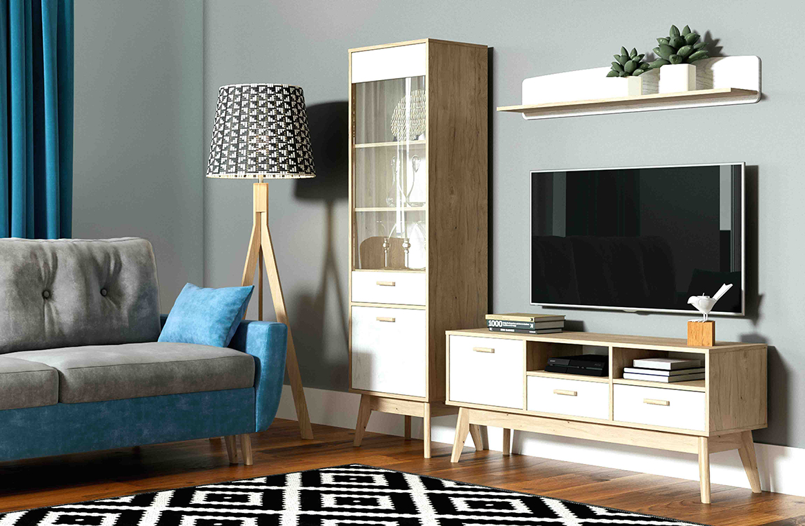 Для обустройства ТВ-зоны удобно использовать стенки или специальные тумбы. Конструкции предусматривают размещение аудиосистем, книг, посуды, сувениров и других предметов.