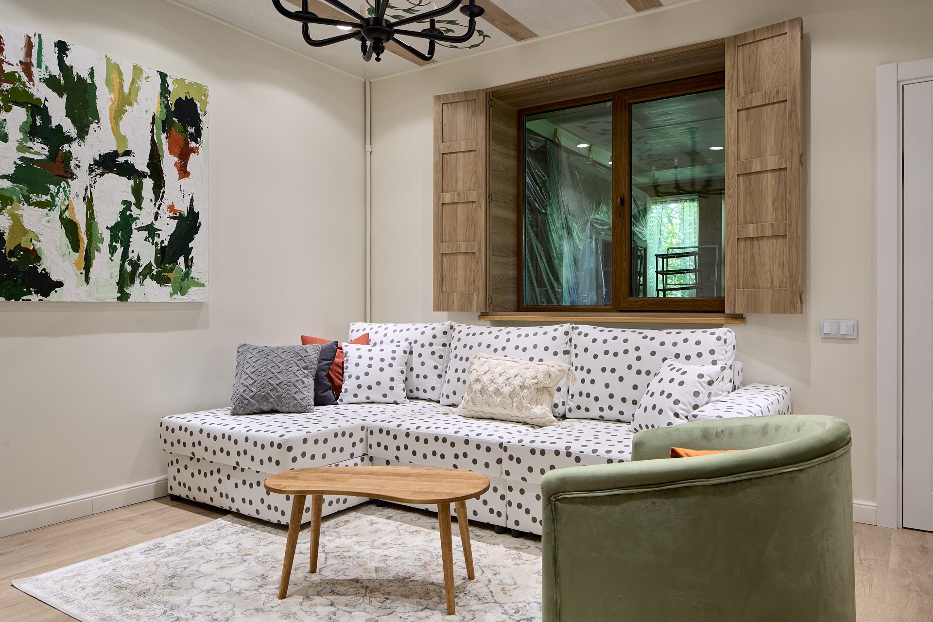 Обновление гостиной стало для героев приятным подарком, который им решила сделать сестра Дмитрия. Источником вдохновения при создании интерьера стали кованые цветы, которые украшают решетку камина героев передачи. И важной частью гостиной, естественно, стал удобный диван в обивке в горошек, как элемент деревенского стиля в современном загородном пространстве.