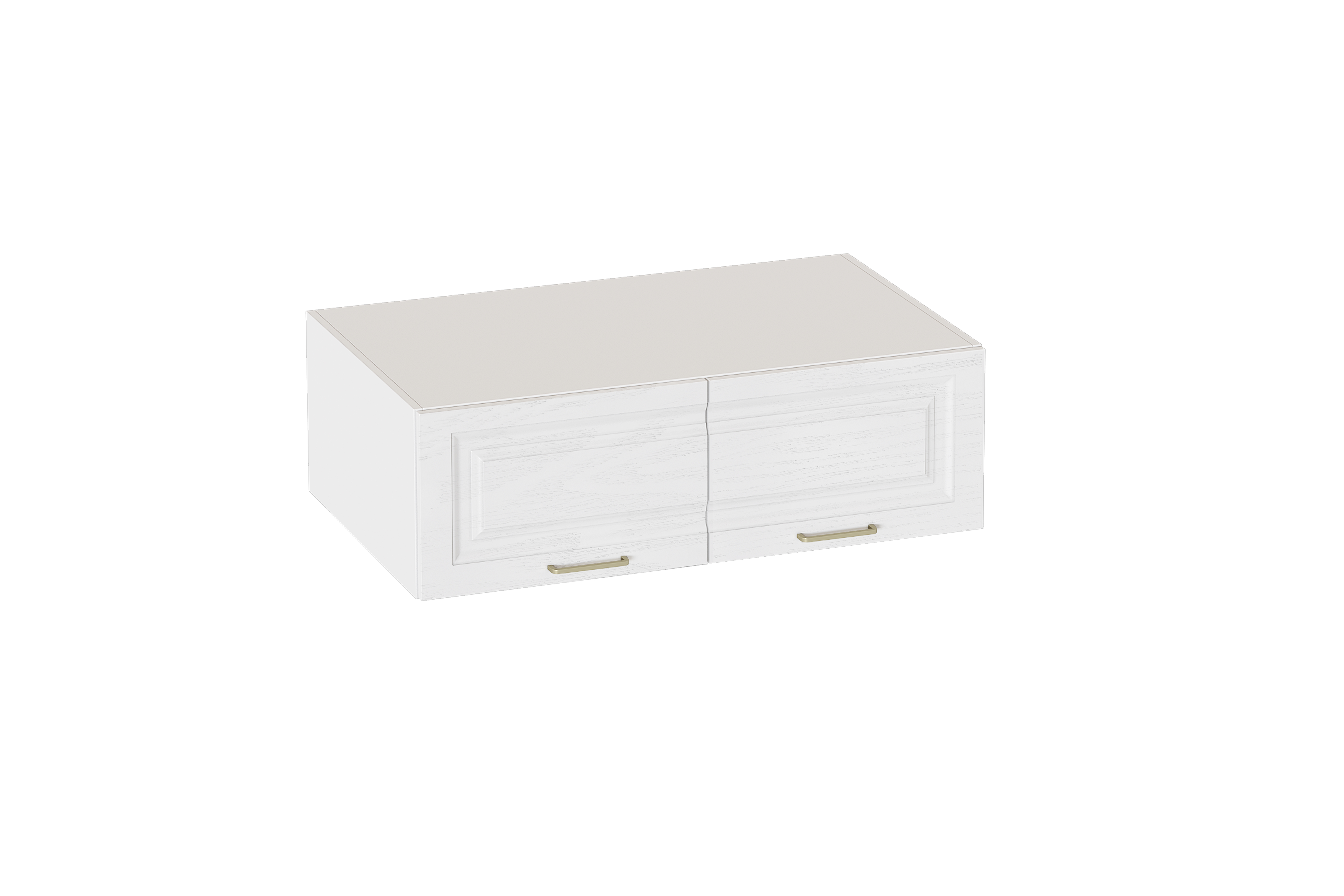 Антресоль выполнена в цвете Айс 06 / Белый Аляска. Классическая фрезеровка фасадов и ручки-скобы из брашированного золота придают изделию особый шарм и элегантность. Двери оснащены петлями с амортизаторами.