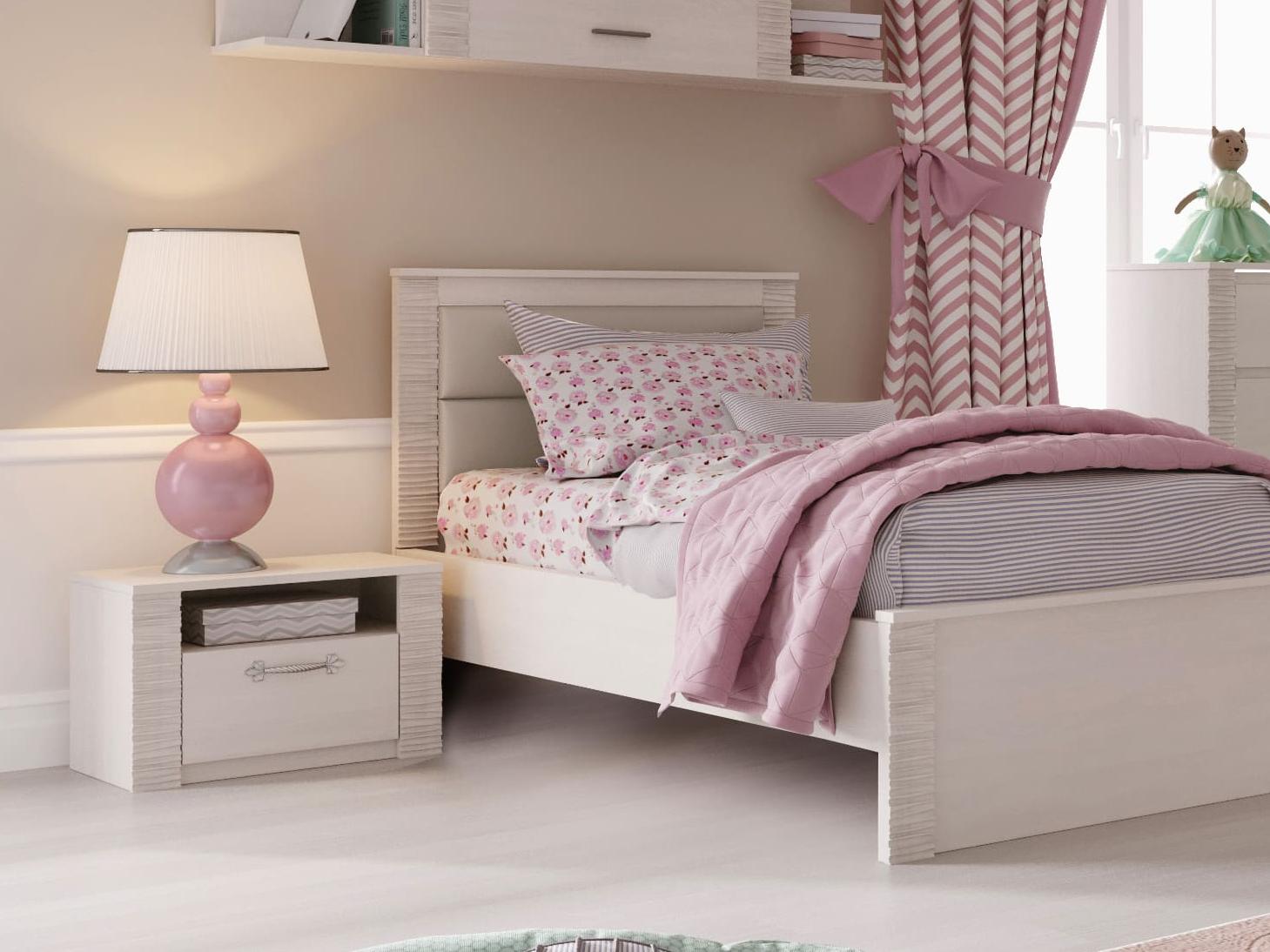 Отличительной особенностью гарнитура является наличие изящной фрезеровки на фасадах, которая придает мебели особый шарм и элегантность. Ручки – скобы гармонично дополняют внешний вид мебели. Изголовье кровати имеет накладку из экокожи, которая позволяет преобразить любой интерьер, сделать его изысканным и уникальным.