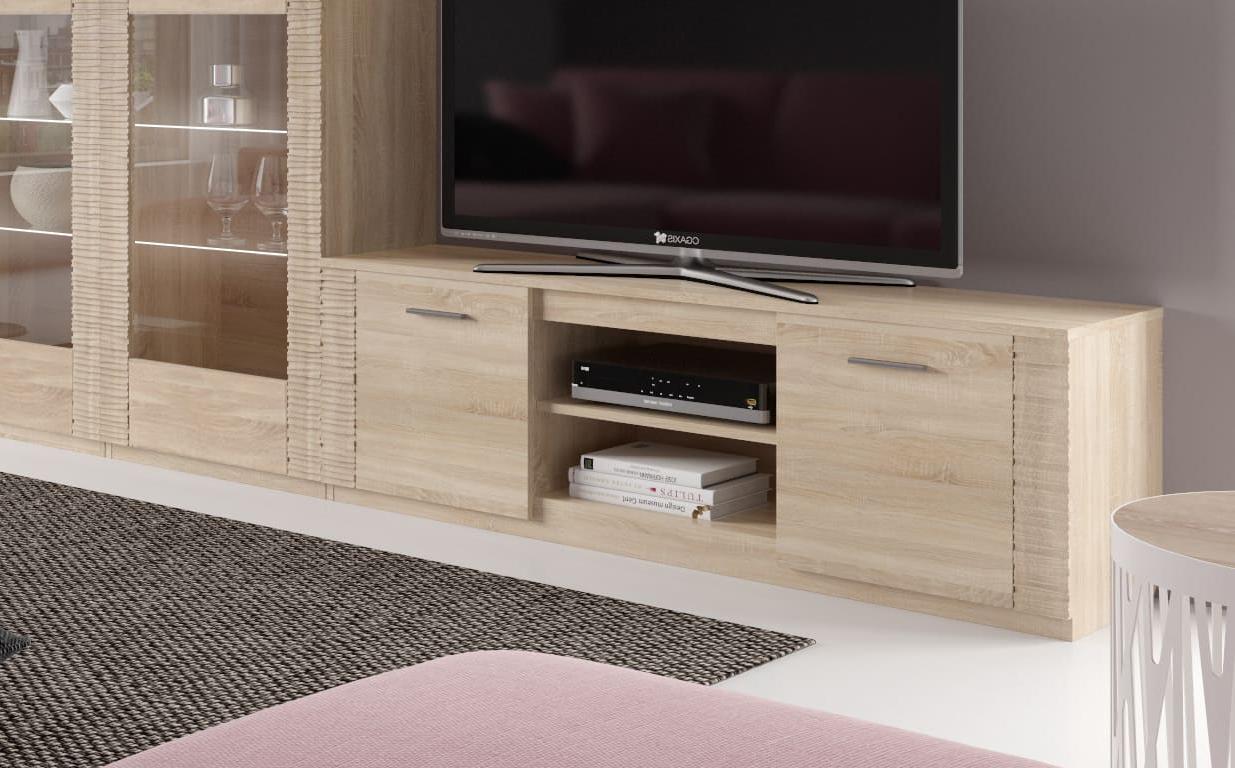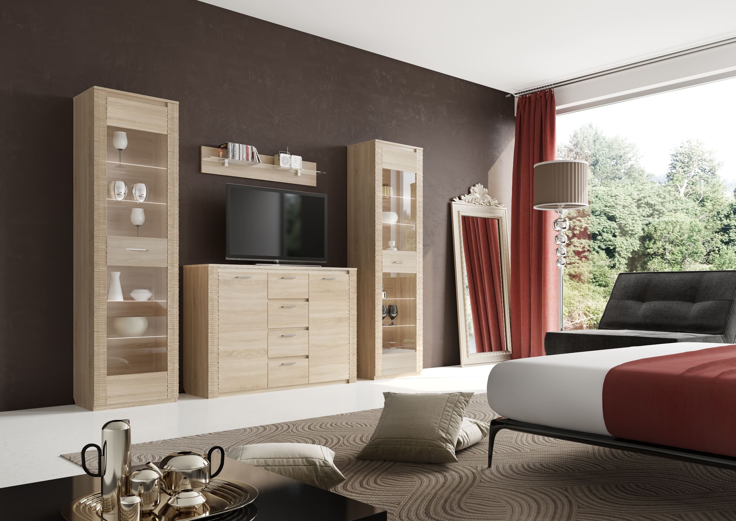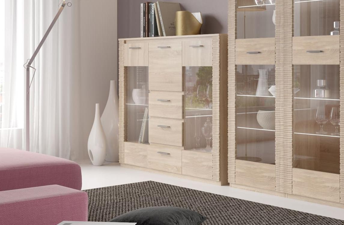 В состав серии входят: витрина, шкаф однодверный, шкаф угловой, шкаф двухдверный, комод с баром, тумба ТВ, полка закрытая, полка.