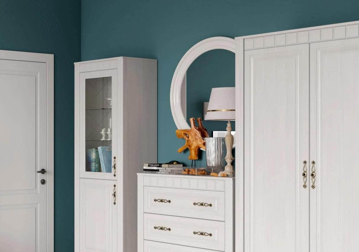 Рамочные фасады с фрезеровкой поддерживают романтичный стиль французской провинции, а ручки-кнопки придают мебели особое обаяние, свойственное прованскому стилю. Стекло шкафа-витрины декорировано алмазной гравировкой в виде ромбов.