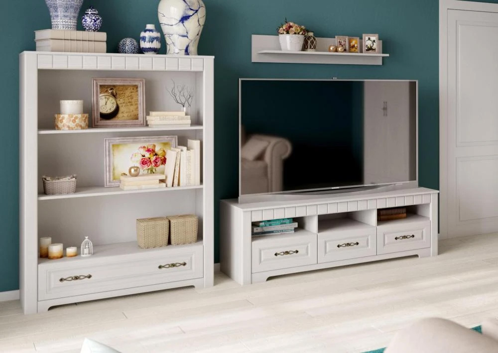 В серию "Прованс" входят: шкаф двухдверный, шкаф-витрина, стеллаж, комод, тумба ТВ, полка навесная.