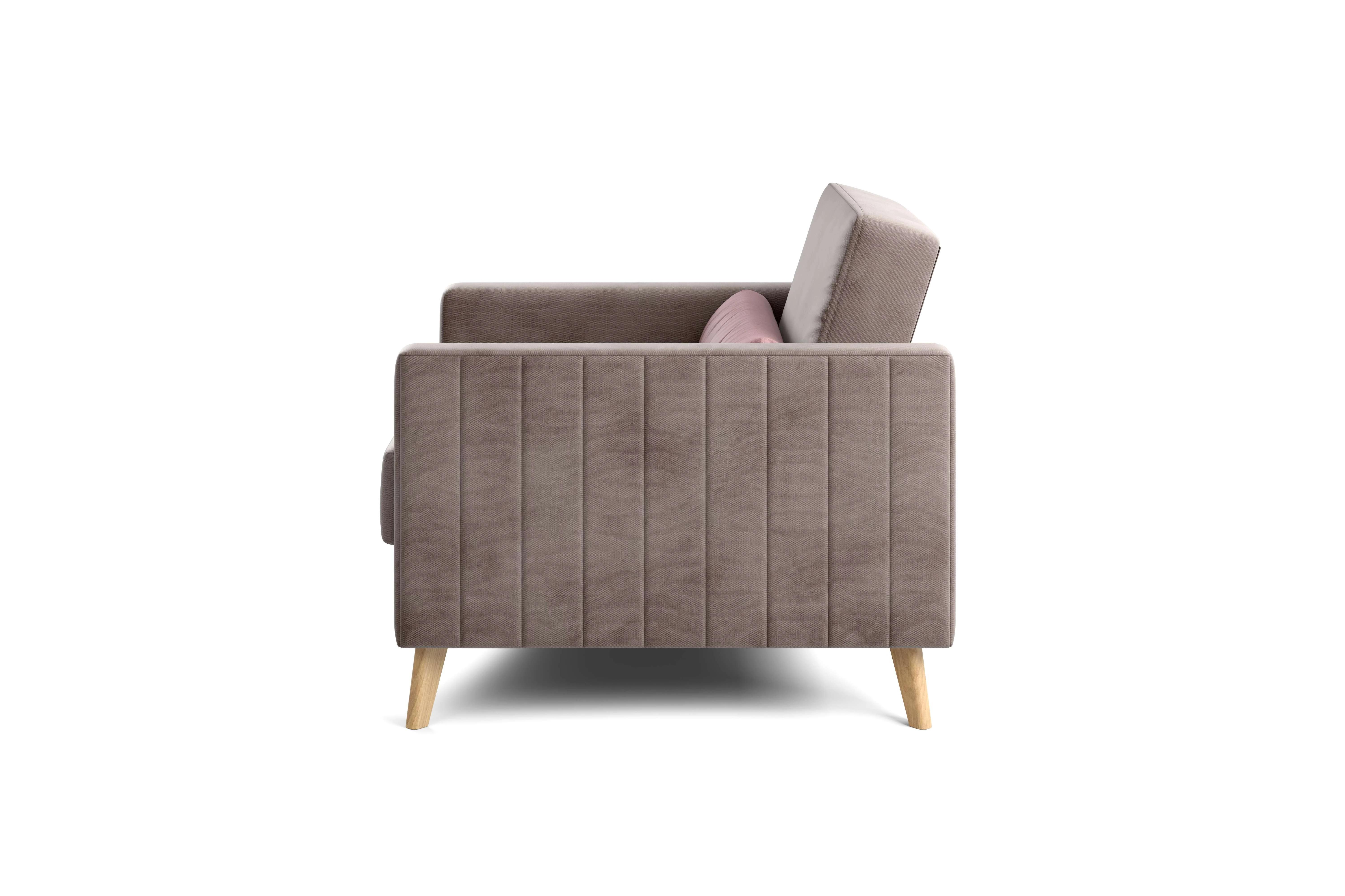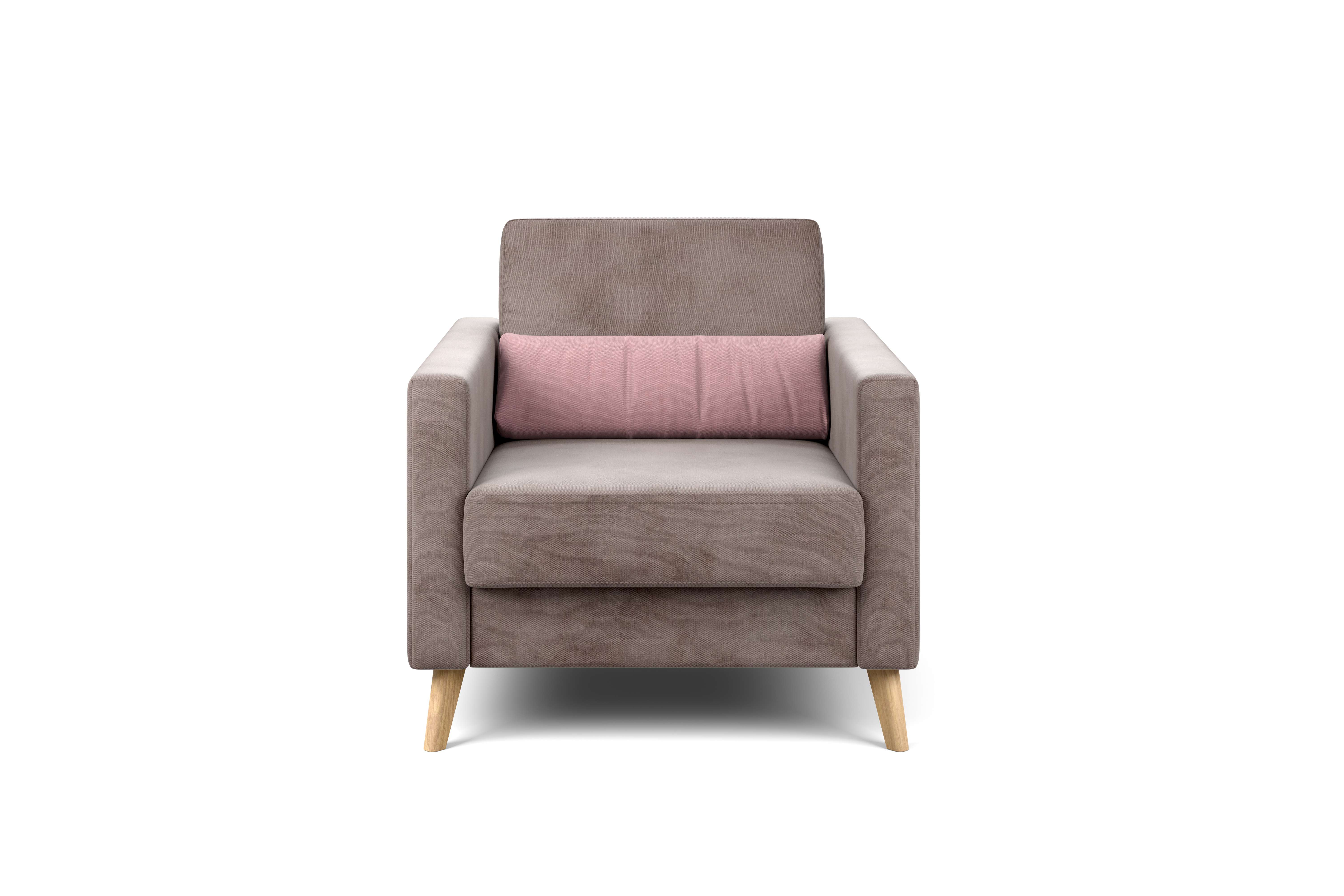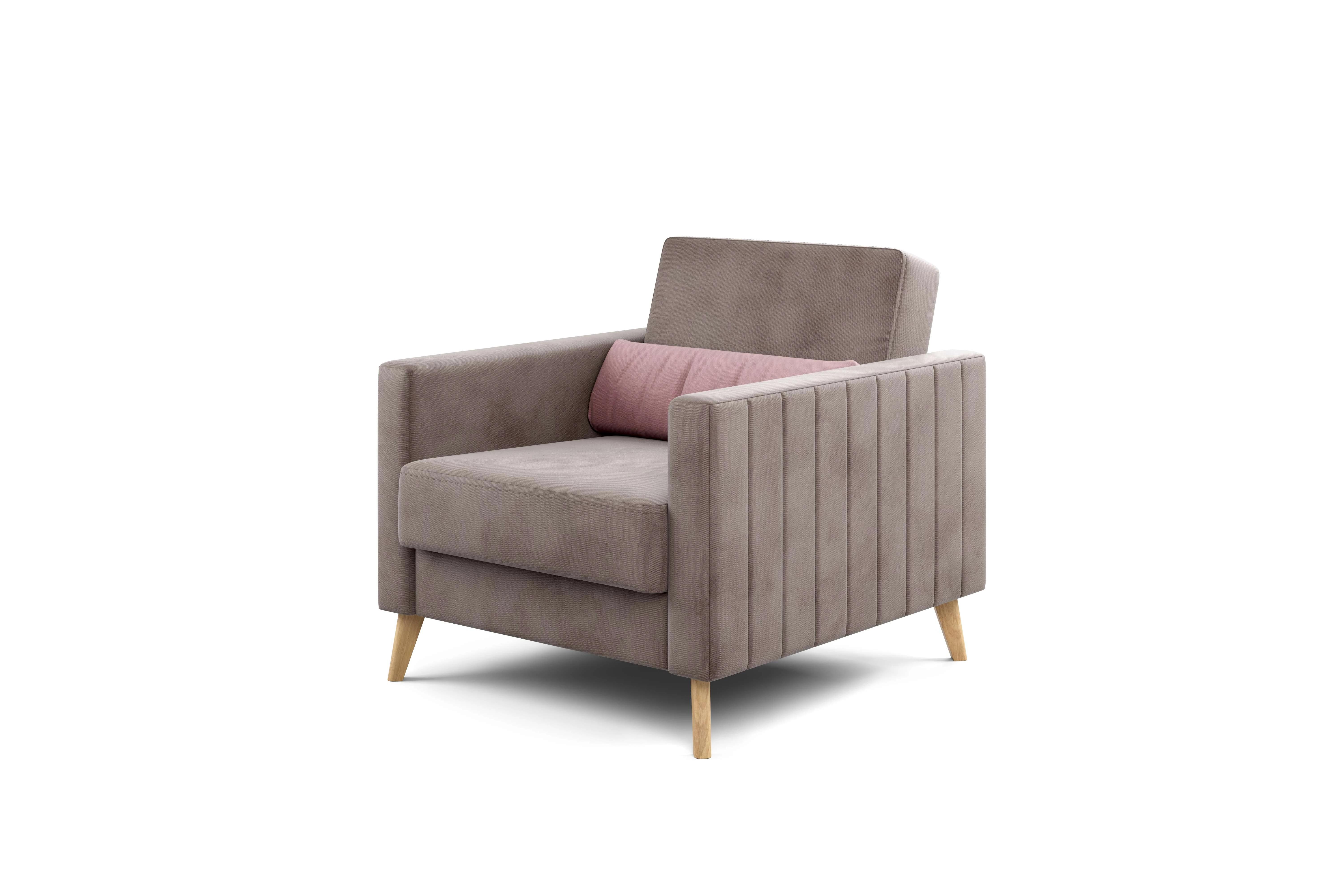 Кресло имеет простой и элегантный силуэт. Обивка из велюра не только роскошно выглядит, но еще и практична в эксплуатации, а также имеет отличные показатели износоустойчивости. Высокие опоры из массива березы придают креслу визуальную лёгкость, декоративная отстрочка на боковинах придает приятный объем. Подушки из велюра контрастного цвета входят в комплект.