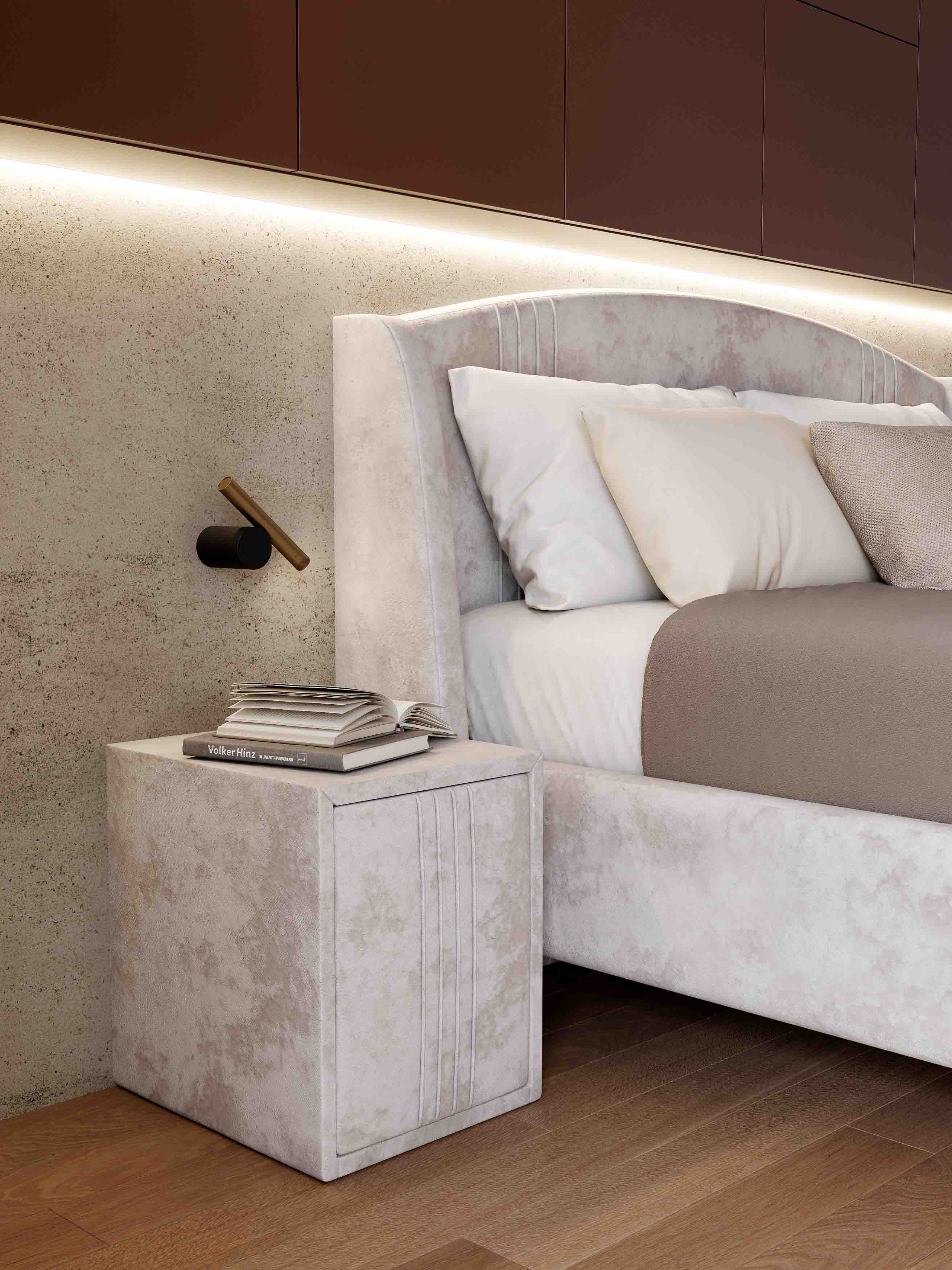Каркас кровати обит мягким и приятным на ощупь велюром, который хорошо держит форму, устойчив к механическим воздействиям (в том числе к зацепкам от когтей животных), гипоаллергенен.