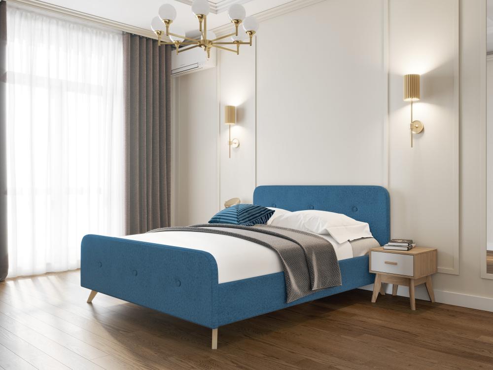 Изголовье имеет закругленный силуэт, обтянут велюровой тканью с пуговицами, что обеспечивает дополнительную мягкость и уют. Высокие стильные ножки из массива березы создадут ощущение легкости и воздушности.