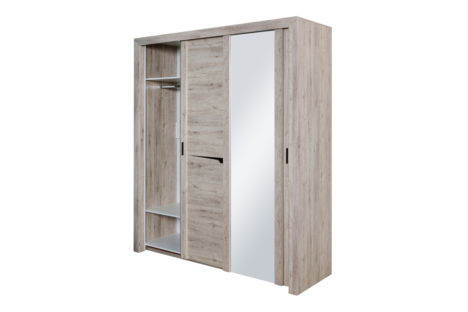 Внутреннее пространство шкафа разделено стенками на три отделения, по бокам располагаются платяные, а по центру бельевое с тремя съемными и двумя стационарными полками. В платяных отделениях установлено по одной продольной стальной штанге, над которыми размещается стационарная, а в низу съемная щитовая полка. Фасадная часть шкафа выполнена в виде трех дверей. На центральной двери наклеено зеркало, по бокам от которого закреплены две декоративные планки из МДФ. Боковые двери имеют составную конструкцию с декоративным вырезом и одной боковой планкой с установленной на ней ручкой.