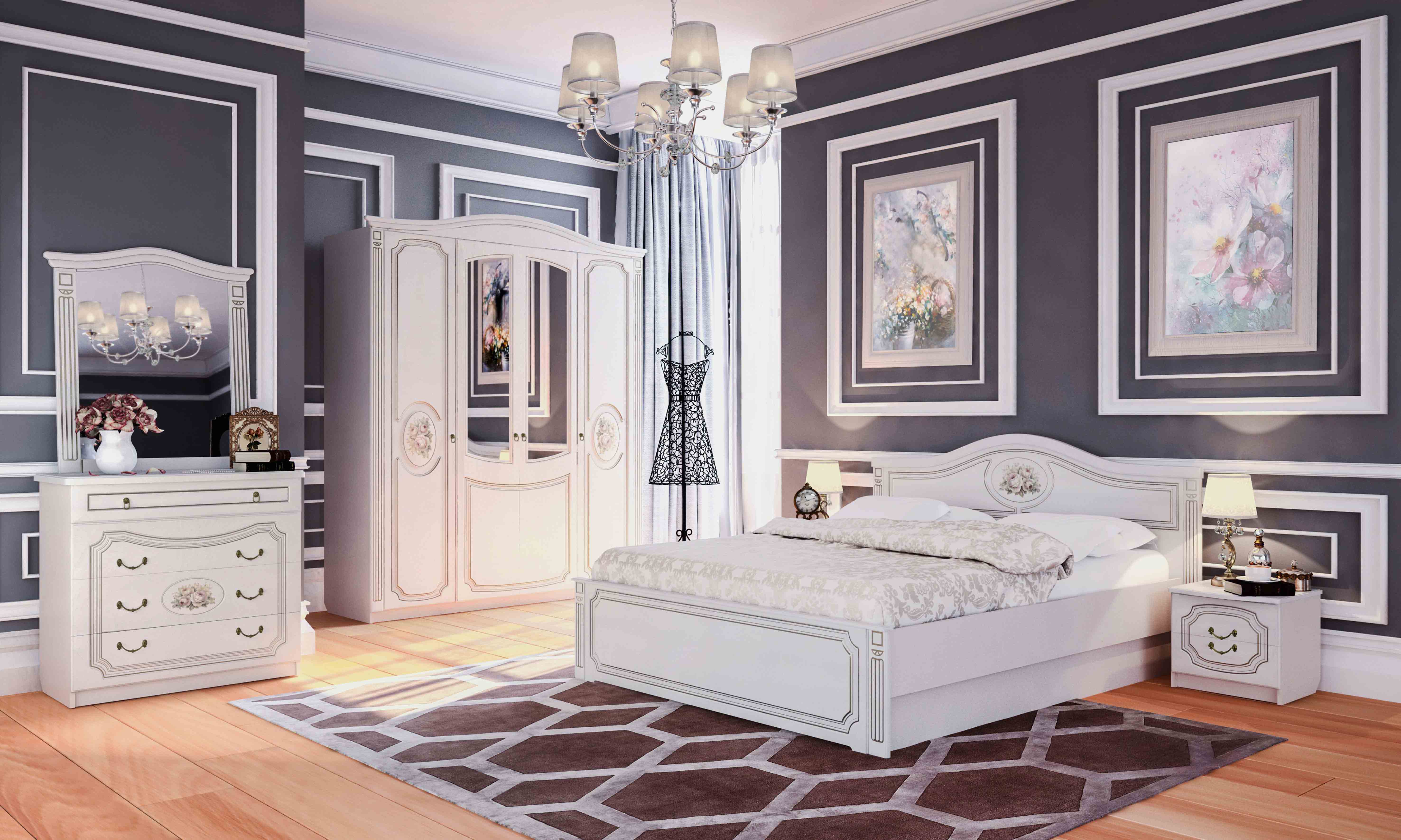 Фасады мебели декорированы элегантной фрезеровкой с эффектом патины и медальоном, на котором изображены розы. Для удобства использования дверцы и ящики оснащены темными металлическими ручками, имитирующими ковку.