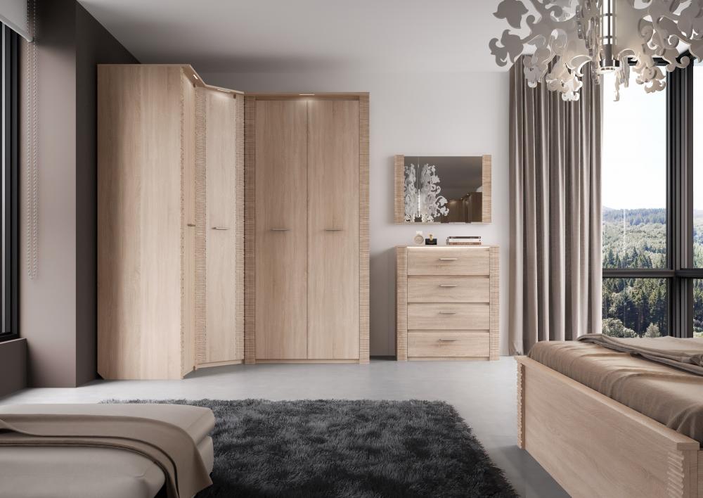 Двухдверный шкаф оснащен двумя отделениями: для белья с четырьмя съёмными и центральной жёсткой полкой; платяное с жесткой полкой и продольной стальной штангой. В колпаке шкафа имеется паз для светильника, входящего в комплект. Блок питания приобретается отдельно, и рассчитан на подключение шести светильников.