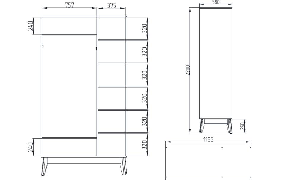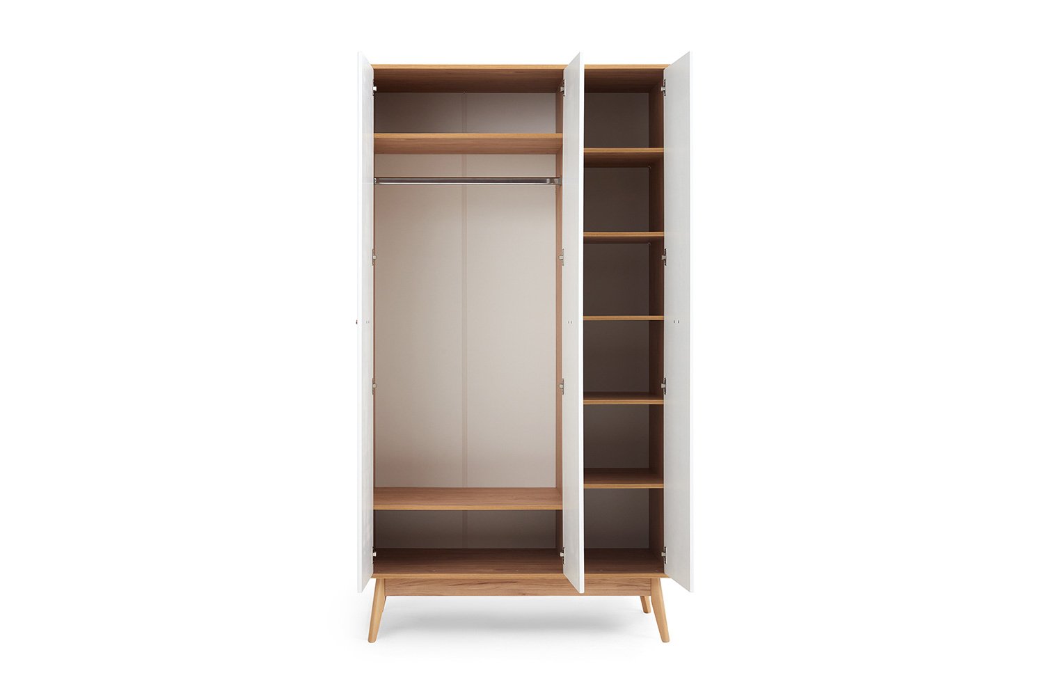 Распахнув две дверцы, вы обнаружите просторную секцию со штангой для одежды на плечиках, и две глубокие просторные полки (вверху и внизу шкафа) для хранения различных вещей и предметов, а открыв третью, боковую створку — получите доступ к вертикальному ряду достаточно глубоких и вместительных полок. Шкаф отлично сочетается с комодом Калгари для спальни.