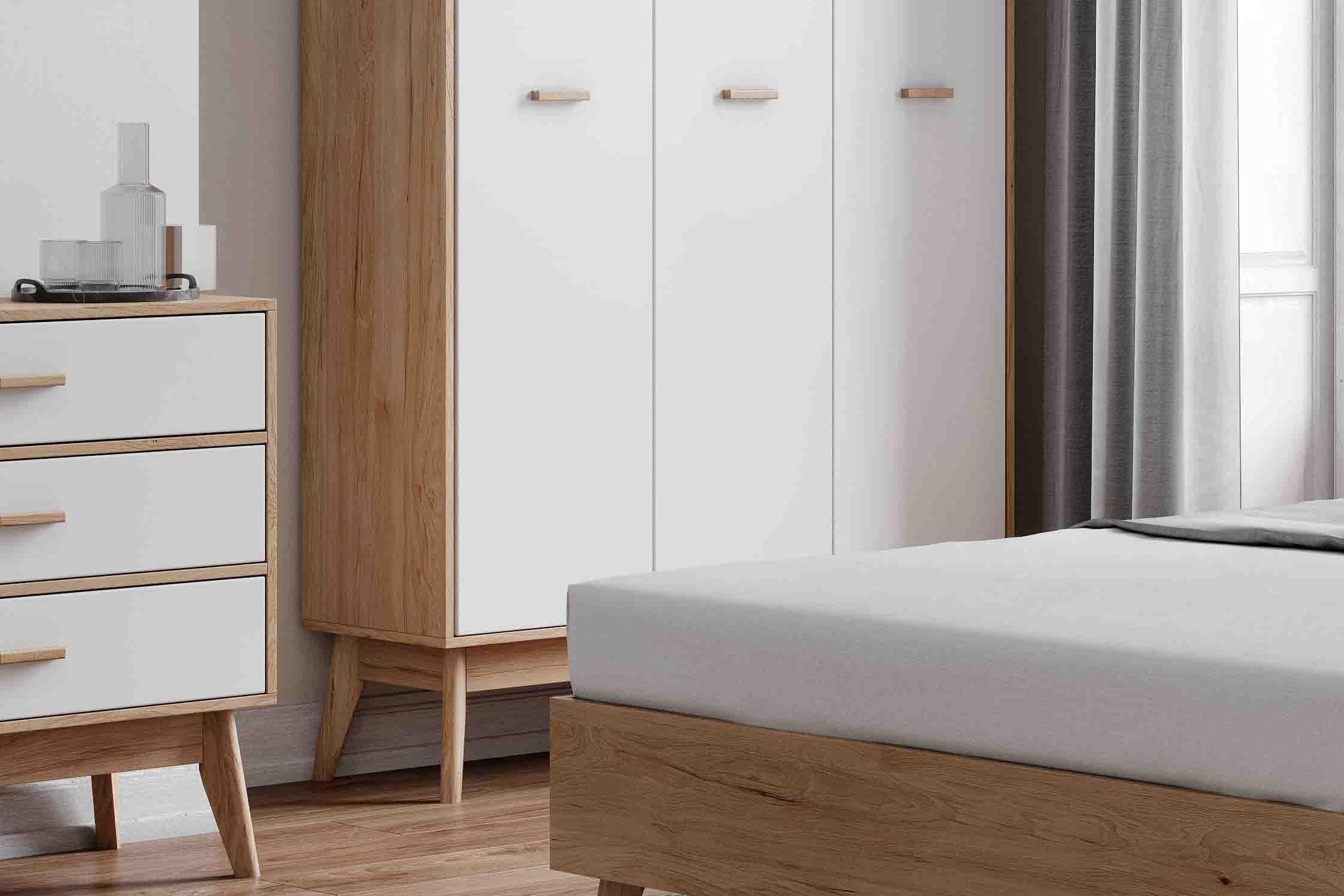 Корпус шкафа из ЛДСП цвета натурального дуба, а фасады - это белоснежный матовый МДФ. Ручки шкафа выполнены из массива березы. Несмотря на свои габариты и отличную функциональность, шкаф выглядит очень легким и современным в интерьере спальни, высокие стильные опоры из массива березы обеспечивают пространство под шкафом, удобное как для легкой уборки, так и для дополнительного хранения вещей в стильных коробках.