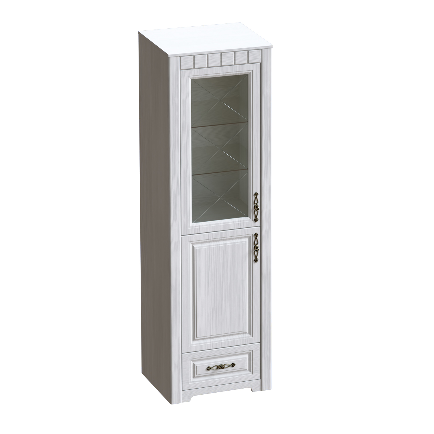Шкаф-витрина изготовлен из качественных и безопасных материалов. Фасад шкафа украшен изящными ручками, которые придают ему особый шарм. Отличительной особенностью данного шкафа является наличие стеклянной витрины, которая позволяет демонстрировать ваши любимые предметы, книги или коллекции.
