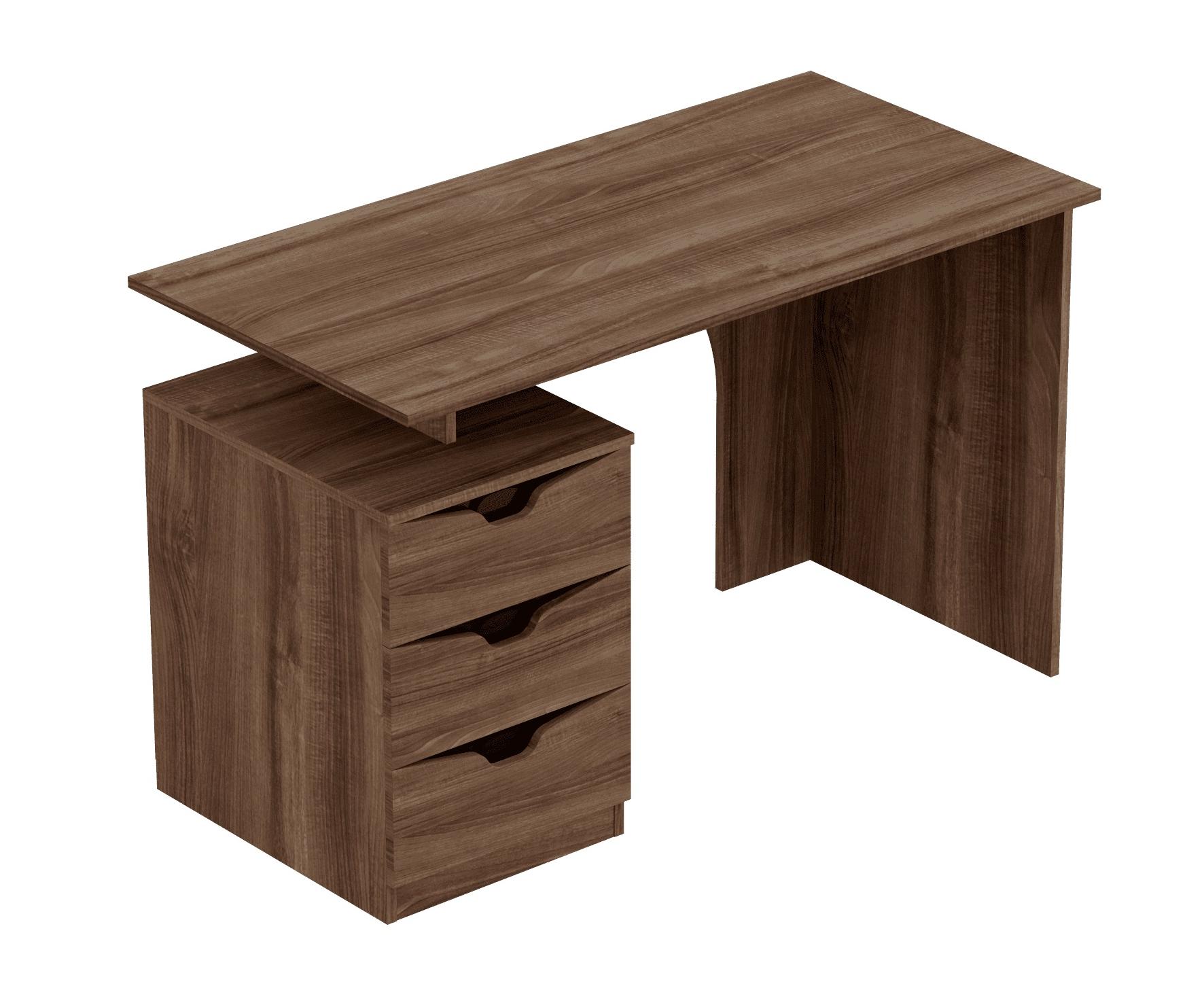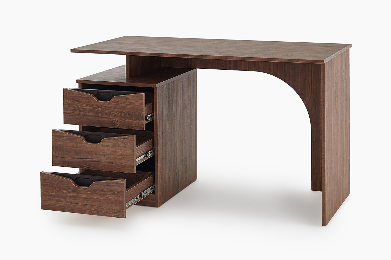 Стол изготовлен из качественных, безопасных материалов, что гарантирует его надежность и долговечность. Он оснащен тумбой с тремя ящиками, которые идеально подходят для хранения документов и канцелярских принадлежностей. Также на столе есть место для монитора компьютера и клавиатуры. На фасаде имеются декоративные вырезы, выполняющие функцию ручек.
