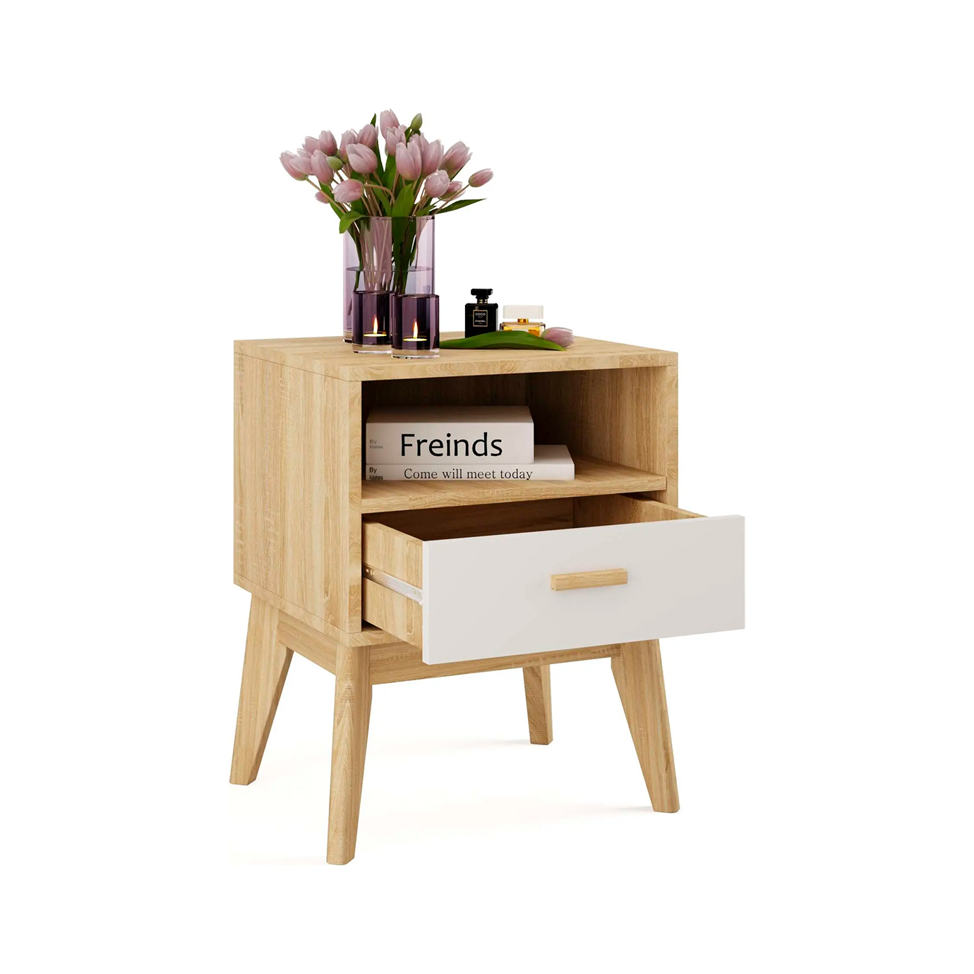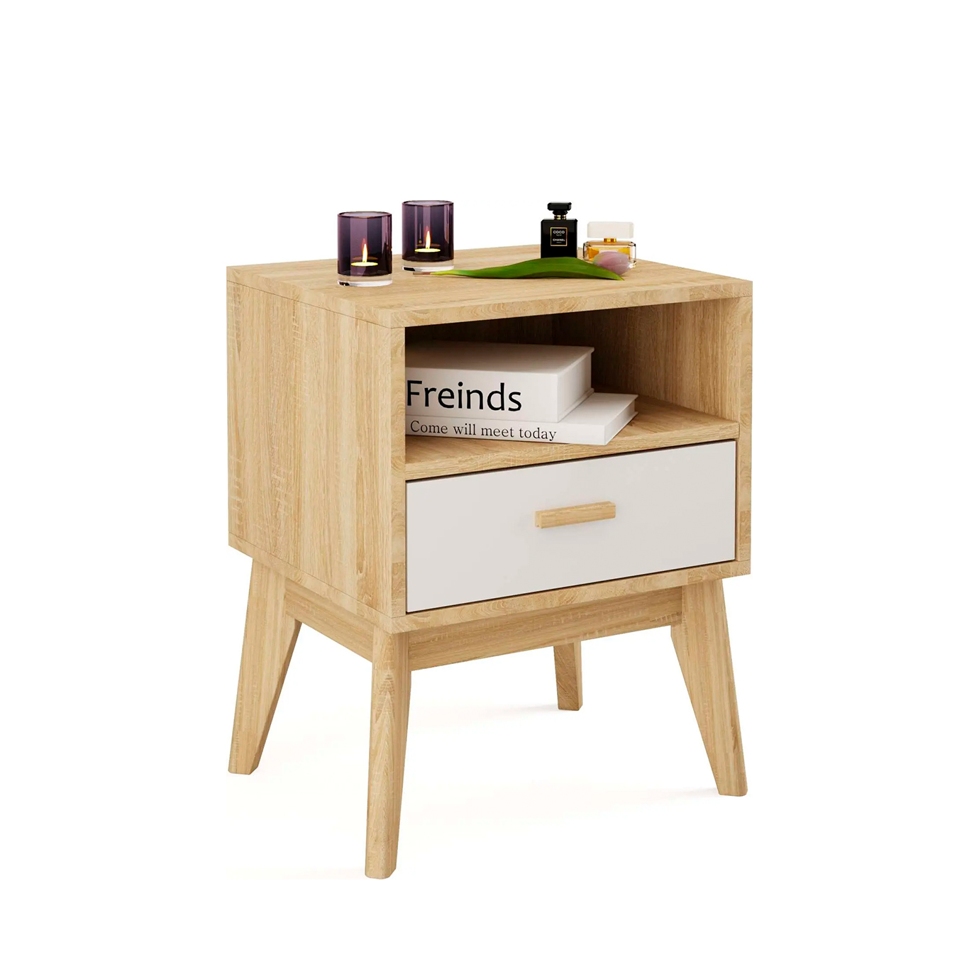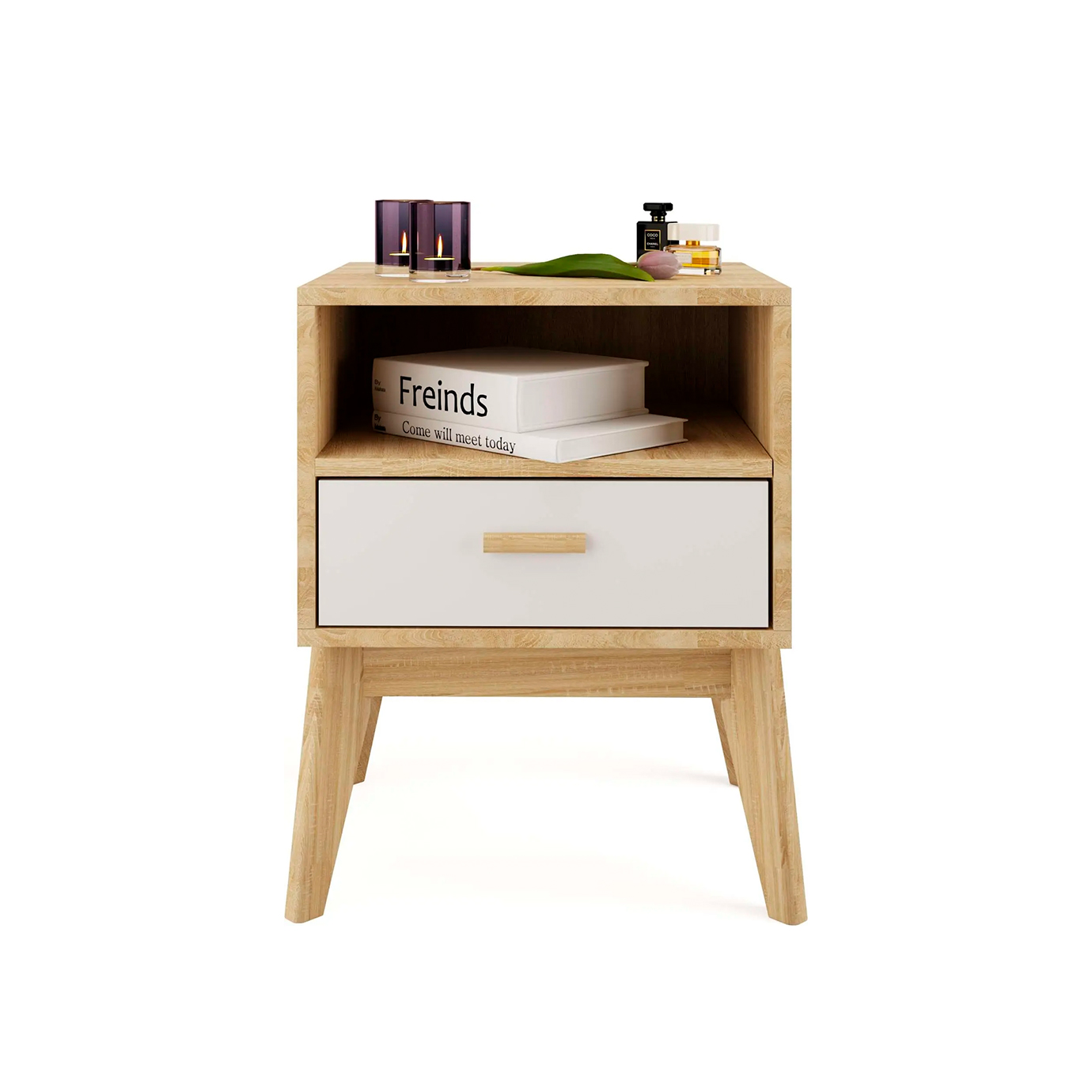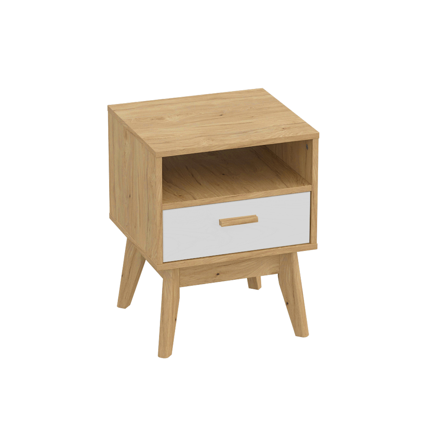 Тумба имеет простой и элегантный дизайн, который идеально вписывается в любой интерьер. Ощущения легкости и нарядности добавляет фасад из белоснежного МДФ в сочетании с корпусом из ЛДСП цвета натурального дуба. Ручка ящика выполнена из массива березы.