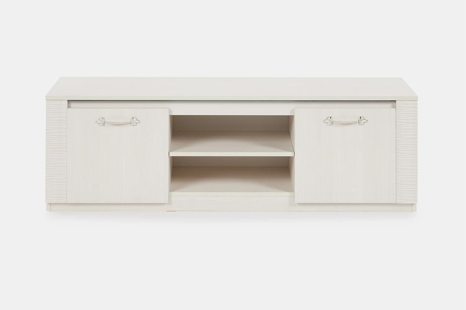 Тумба по ТВ имеет две ниши, закрытые дверцами и центральная открытая с одной съёмной полкой. Под крышкой установлена стеклянная панель для крепления светильников "HLT Prismatic FT".