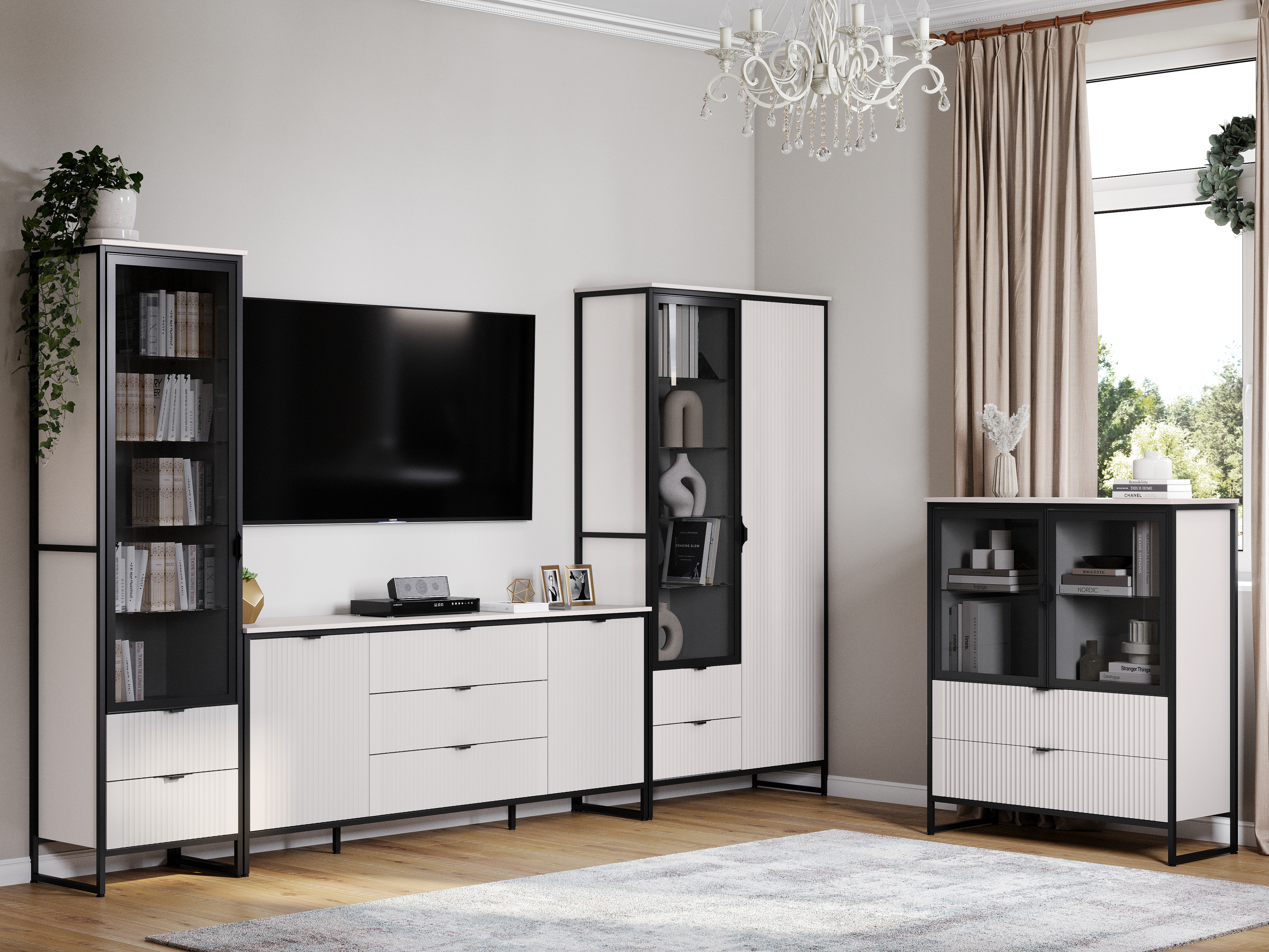 Коллекцию модульной гостиной "Нора" отличает современный оригинальный стиль. Декоративная продольная фрезеровка на фасадах из МДФ и опоры на металлокаркасе цвета соответствуют модным тенденциям этого года в ведущих зарубежных коллекциях.