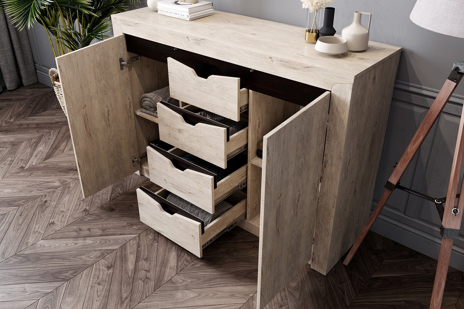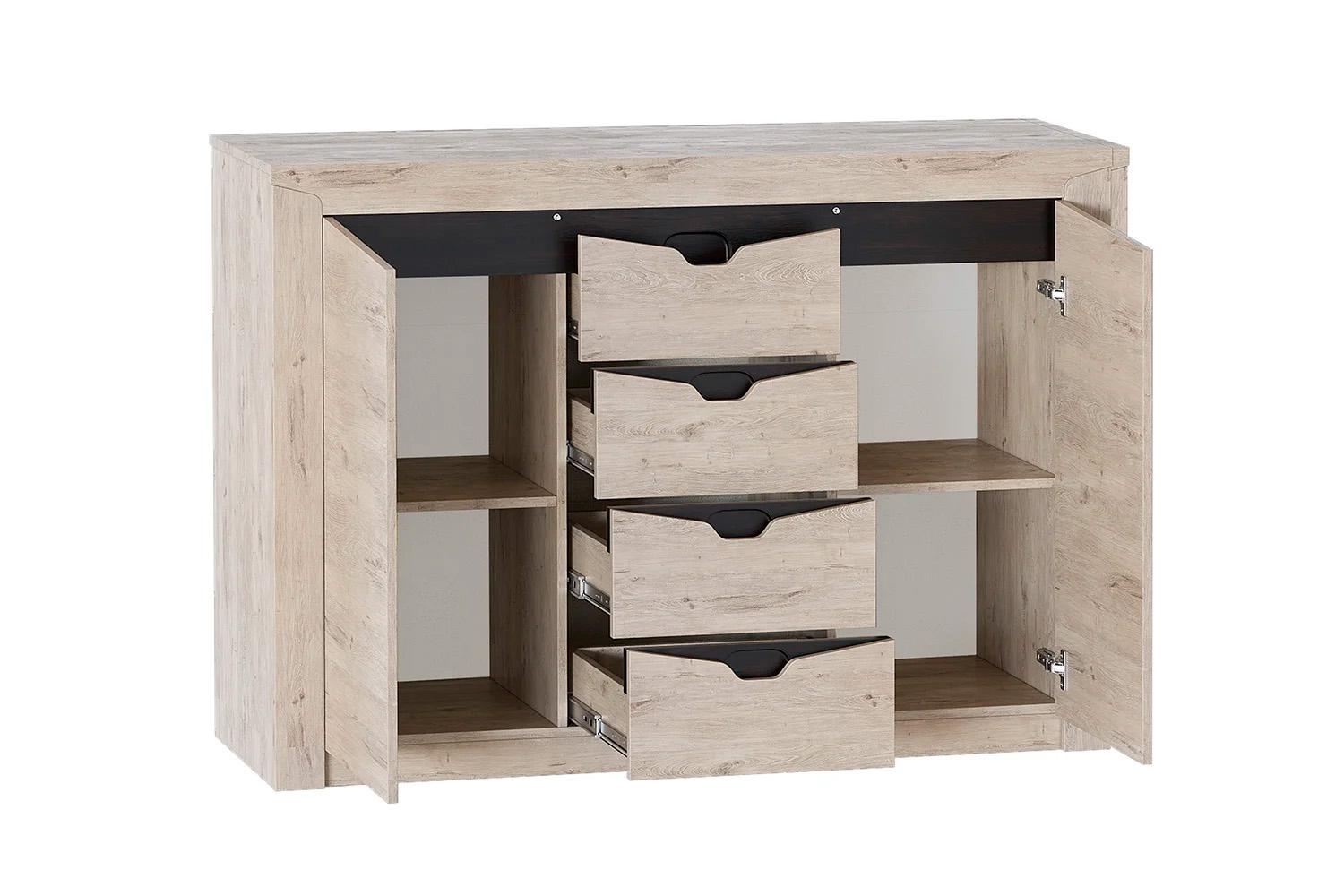 Тумба "Соренто" имеет четыре выдвижных ящика, а также два вместительных отделения по бокам с полками и распашными дверями. На фасаде имеются декоративные вырезы, выполняющие функцию ручек.