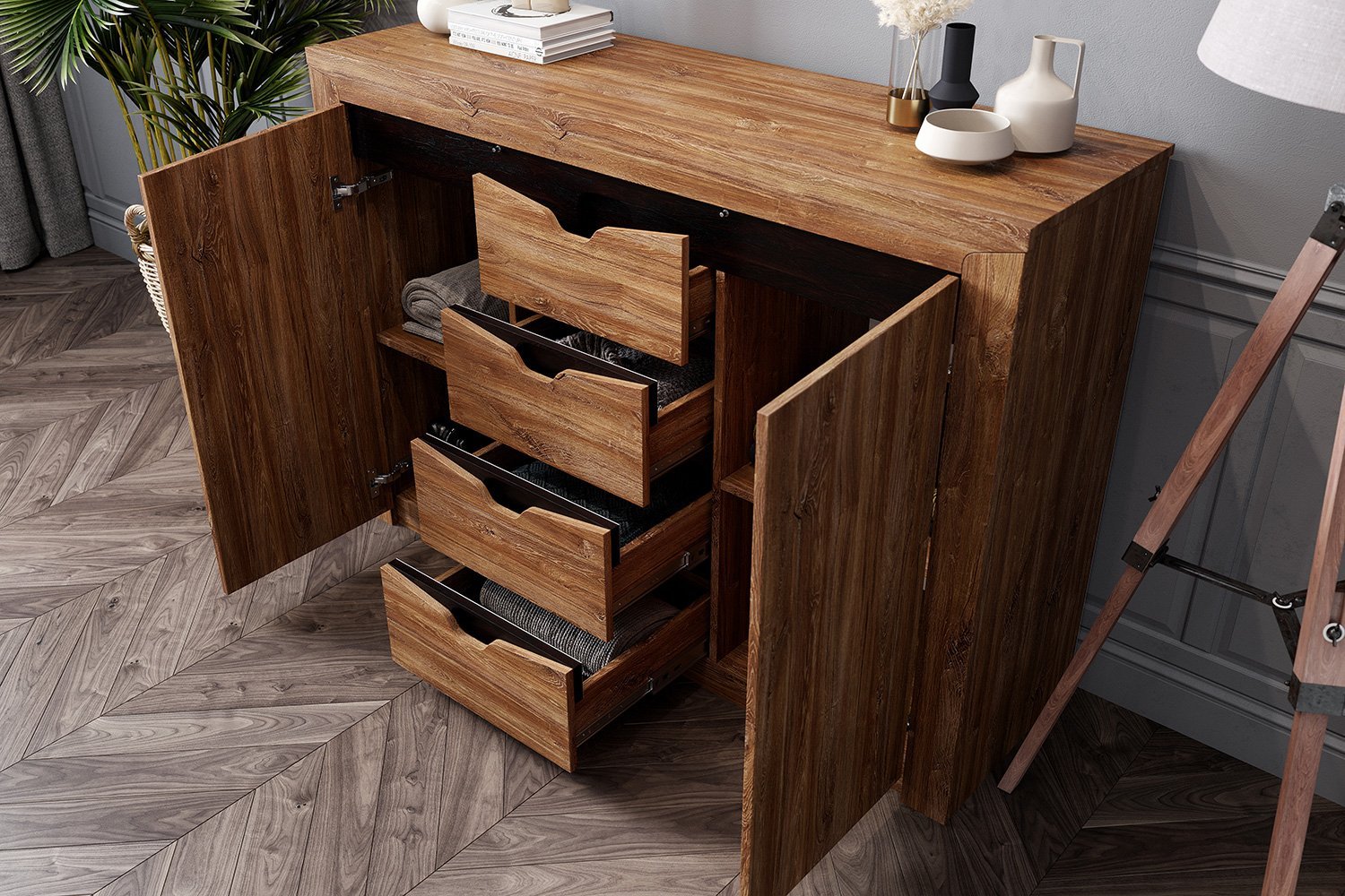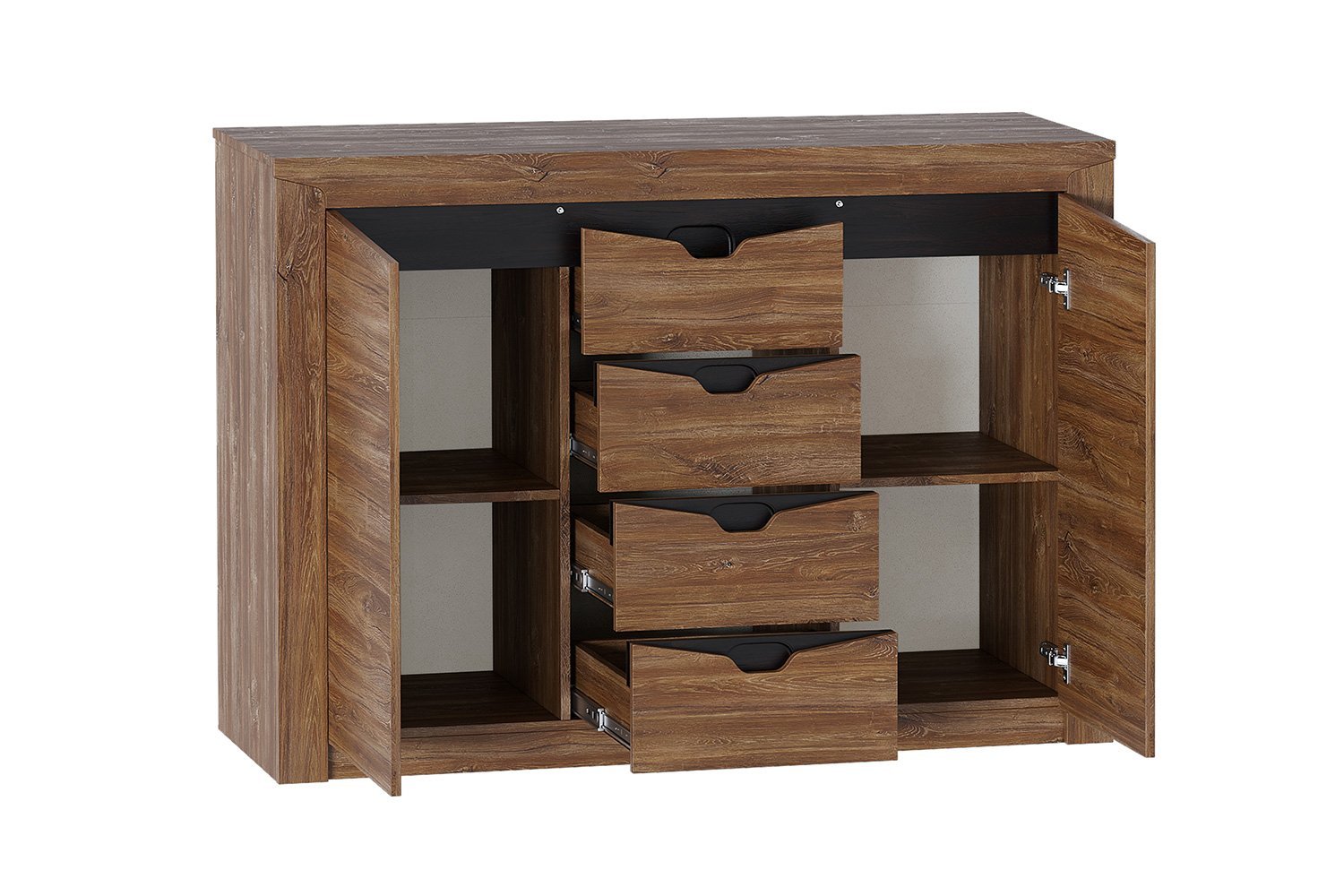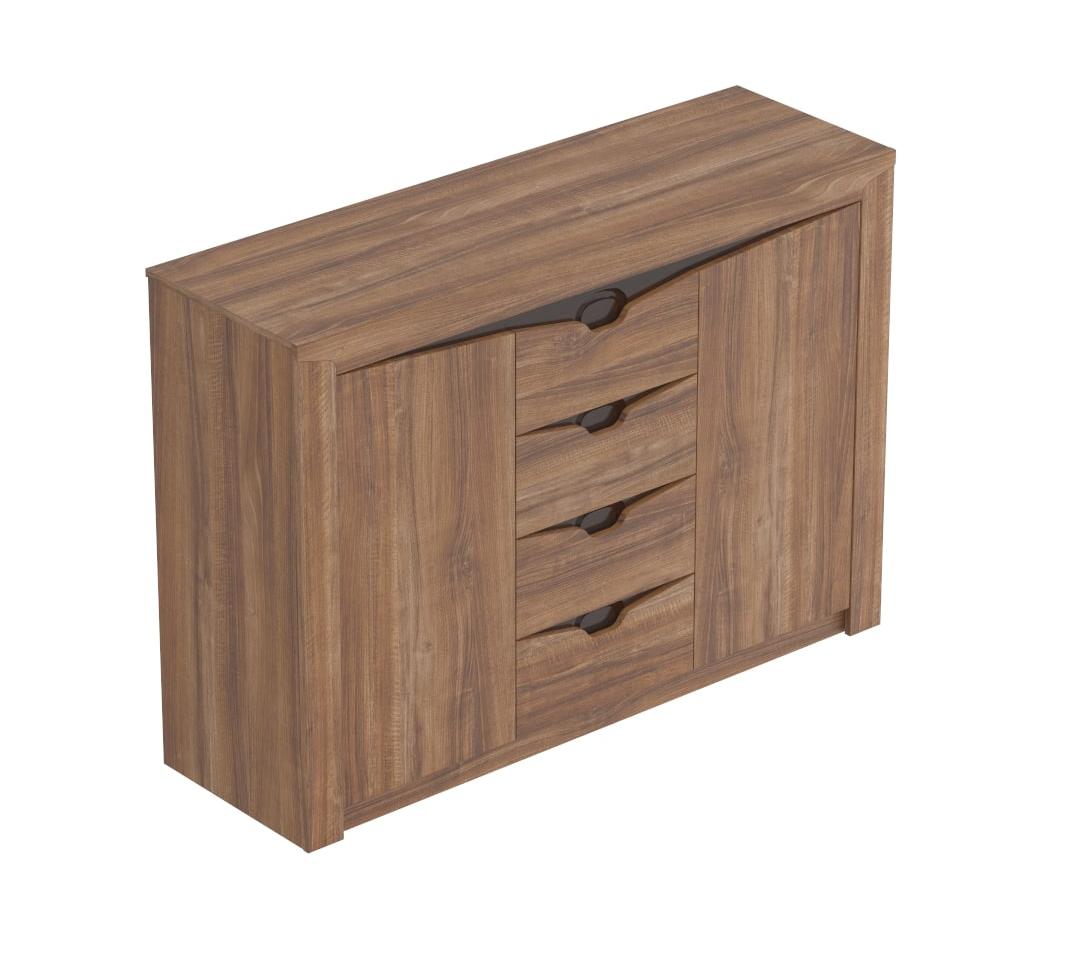 Тумба "Соренто" имеет четыре выдвижных ящика, а также два вместительных отделения по бокам с полками и распашными дверями. На фасаде имеются декоративные вырезы, выполняющие функцию ручек.