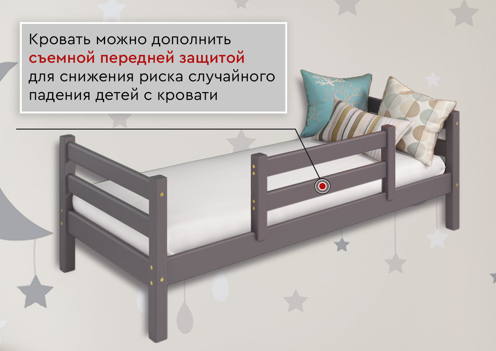 Кровать можно дополнить съемной передней защитой для снижения риска случайного падения детей с кровати. Матрас и выдвижные ящики приобретаются отдельно.