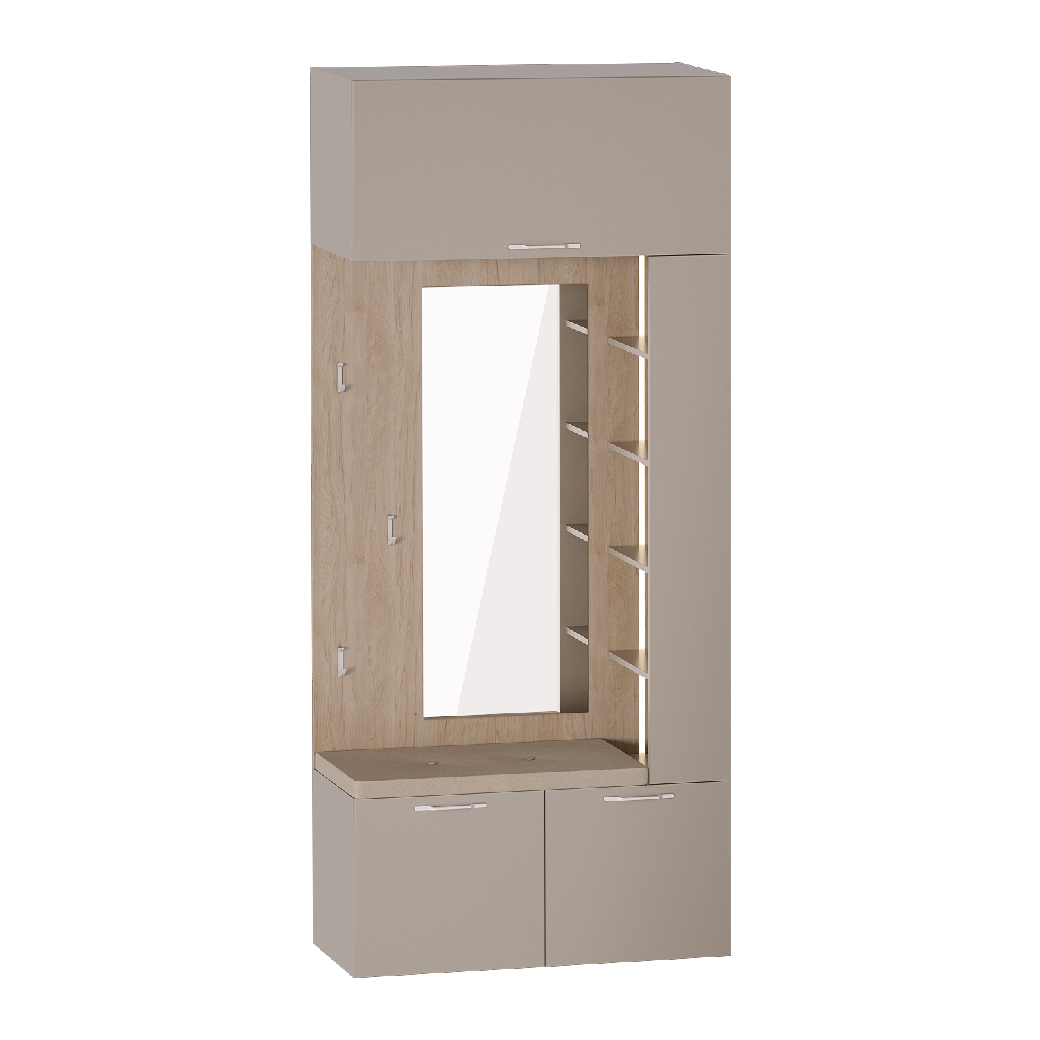 Верхняя полка модуля имеет встроенный газлифт и позволит разместить объемный чемодан. Вертикальный ряд полок выполнен на правую сторону, при желании можно распахнуть створку, прикрывающую ряд. Прочные крючки и ручки в форме скобы выполнены из белого матового металла. Все петли - плавного закрывания.